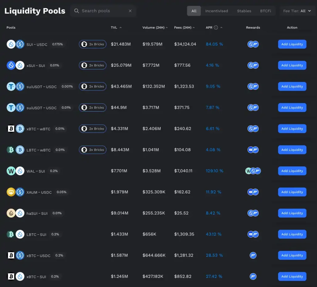 流程上不难实现,用户只需前往 BuidlPad 的 Momentum HODL 活动页面(官方 Medium 有详细流程)、连接钱包后向指定池子(如 SUI/USDC、xBTC/wBTC 等)提供流动性即可。