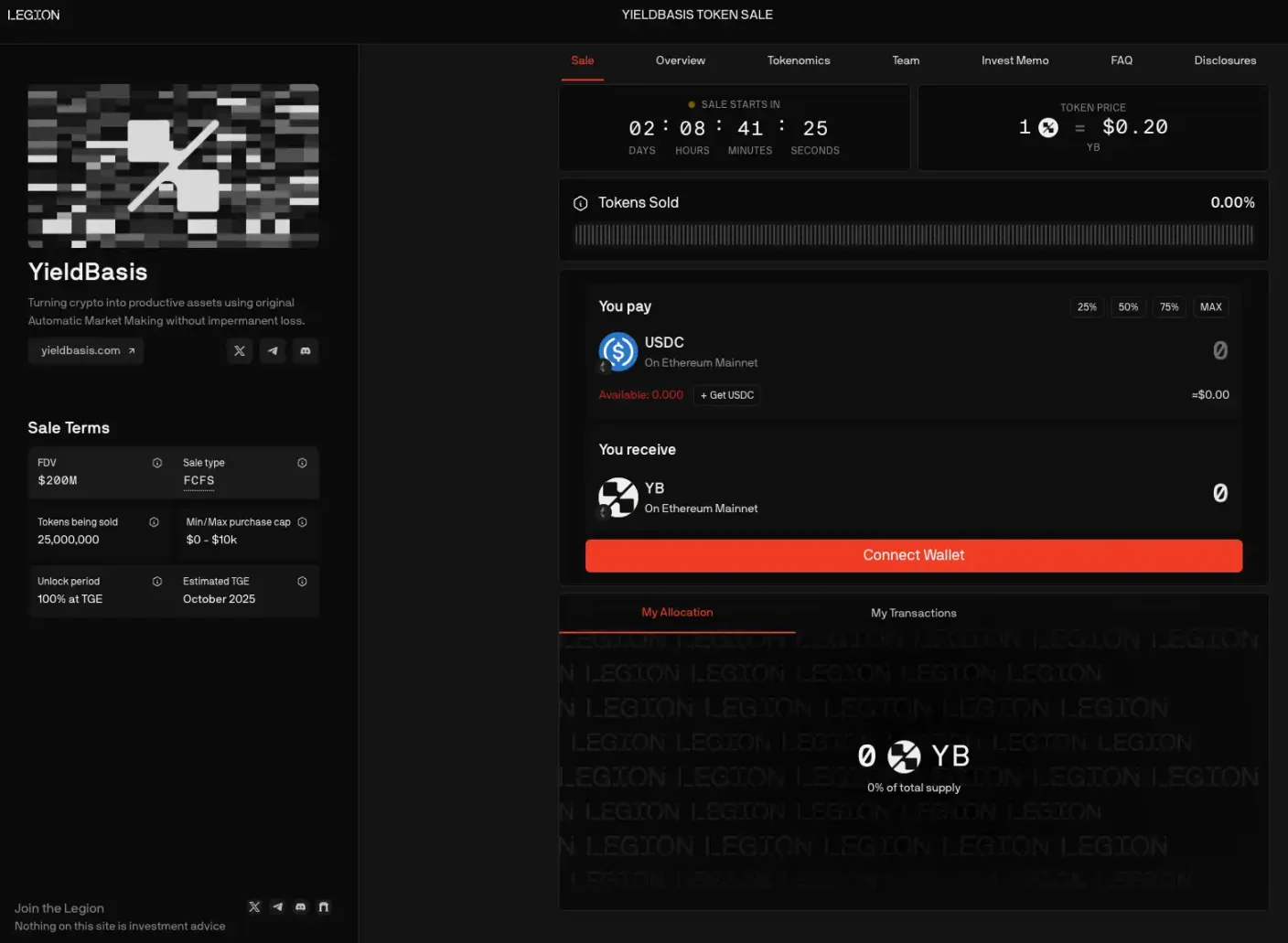 当前了解到的预售模式分为两个阶段,首先预留了 20% 代币供 Legion 高评分用户认购(当前已经开放预存款,项目方将根据你的 Legion 分数进行判定额度),而剩余 80% 份额同时在 Kraken 和 Legion 按 FCFS 的模式公开销售,$YB 在销售结束后将直接上线 Kraken。
