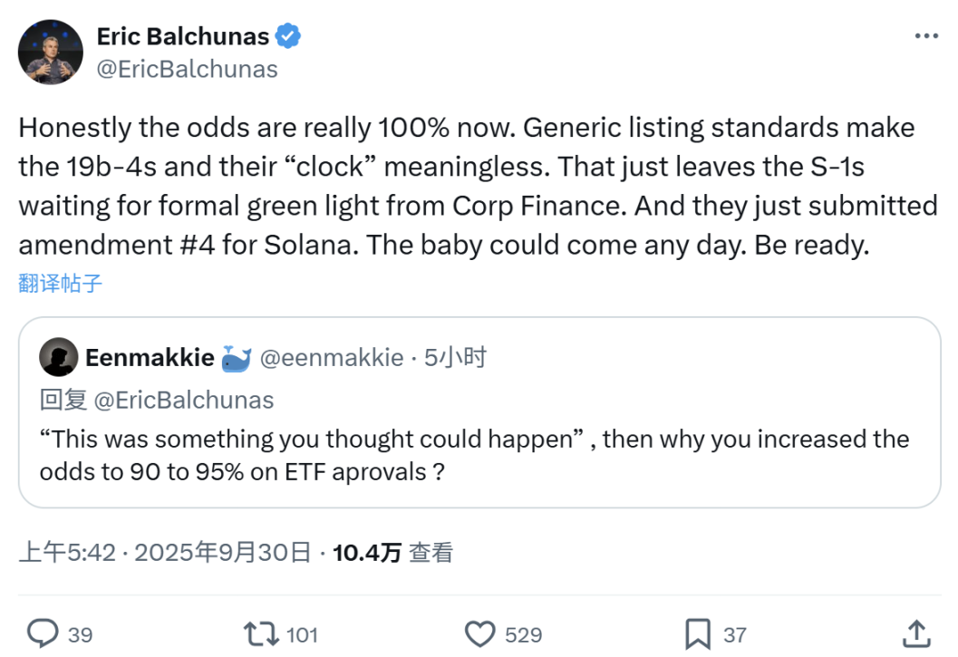 针对 SOL 的现货 ETF 情况,彭博 ETF 分析师 Eric Balchunas 表示,「说实话,SOL 现货 ETF 获批的成功率现在接近 100%。通用的上市标准让 19b-4 文件及其时间节点变得毫无意义,现在就只剩下 S-1 表格相关事宜了。孩子随时都可能出生,做好准备吧。」