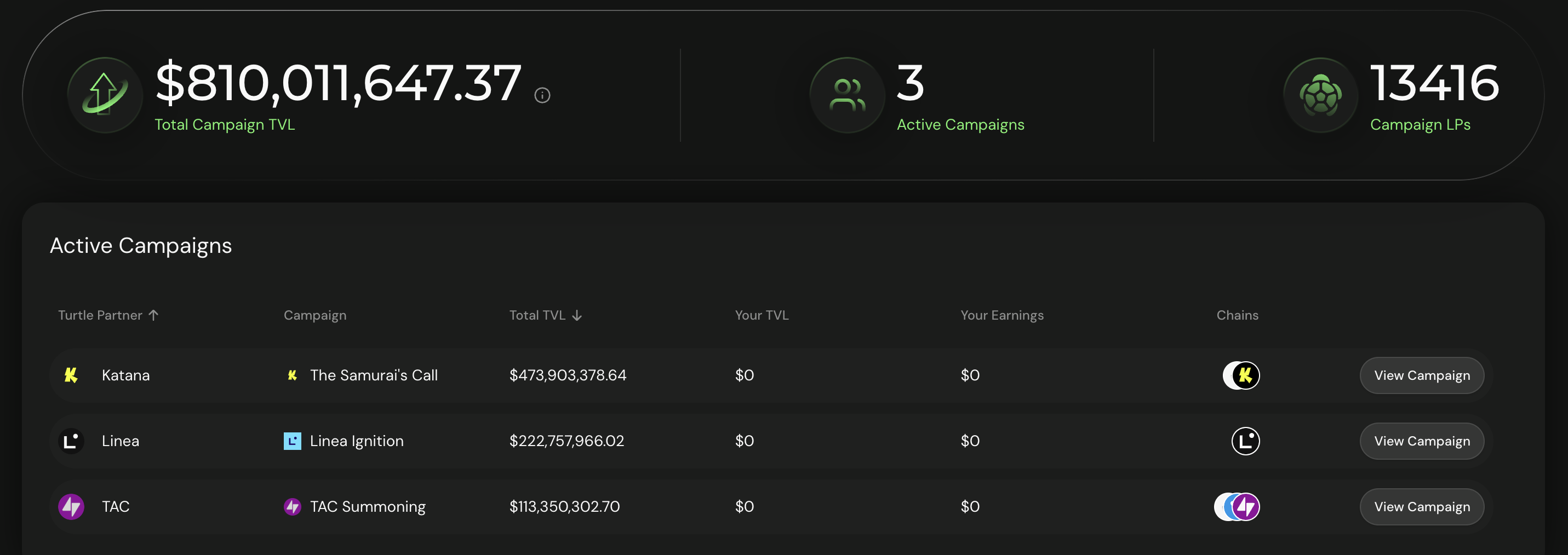 目前 Turtle Campaigns 正在支持的项目(生态)包括了由 Polygon Labs 和 GSR 孵化的专注于 DeFi 的公链 Katana、Consensys 推出的以太坊 L2 Linea、TON 生态 EVM 区块链 TAC,总计引导的流动性超过了 8 亿美元。
