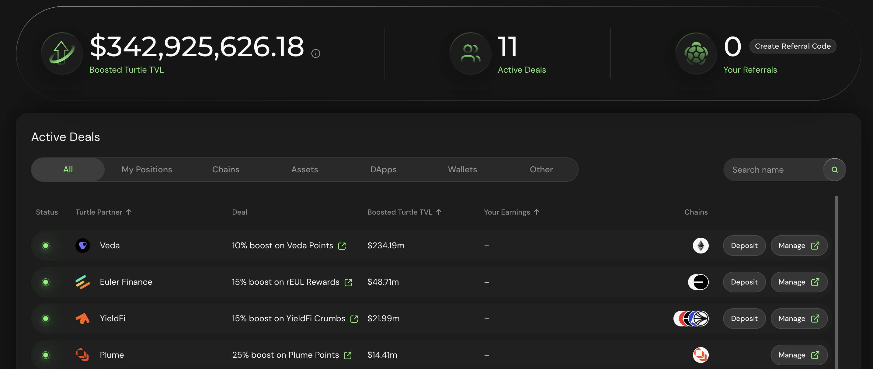 第二款产品名为 Boosted Deals,即 Turtle 合作的项目会向通过 Boosted Deals 提供流动性的用户提供额外的奖励来吸引更多的流动性。同时,Turtle 也会依据提供流动性的用户的实际贡献分发一定量的 TURTLE 代币奖励。该产品目前引导了超 3.4 亿美元的流动性。