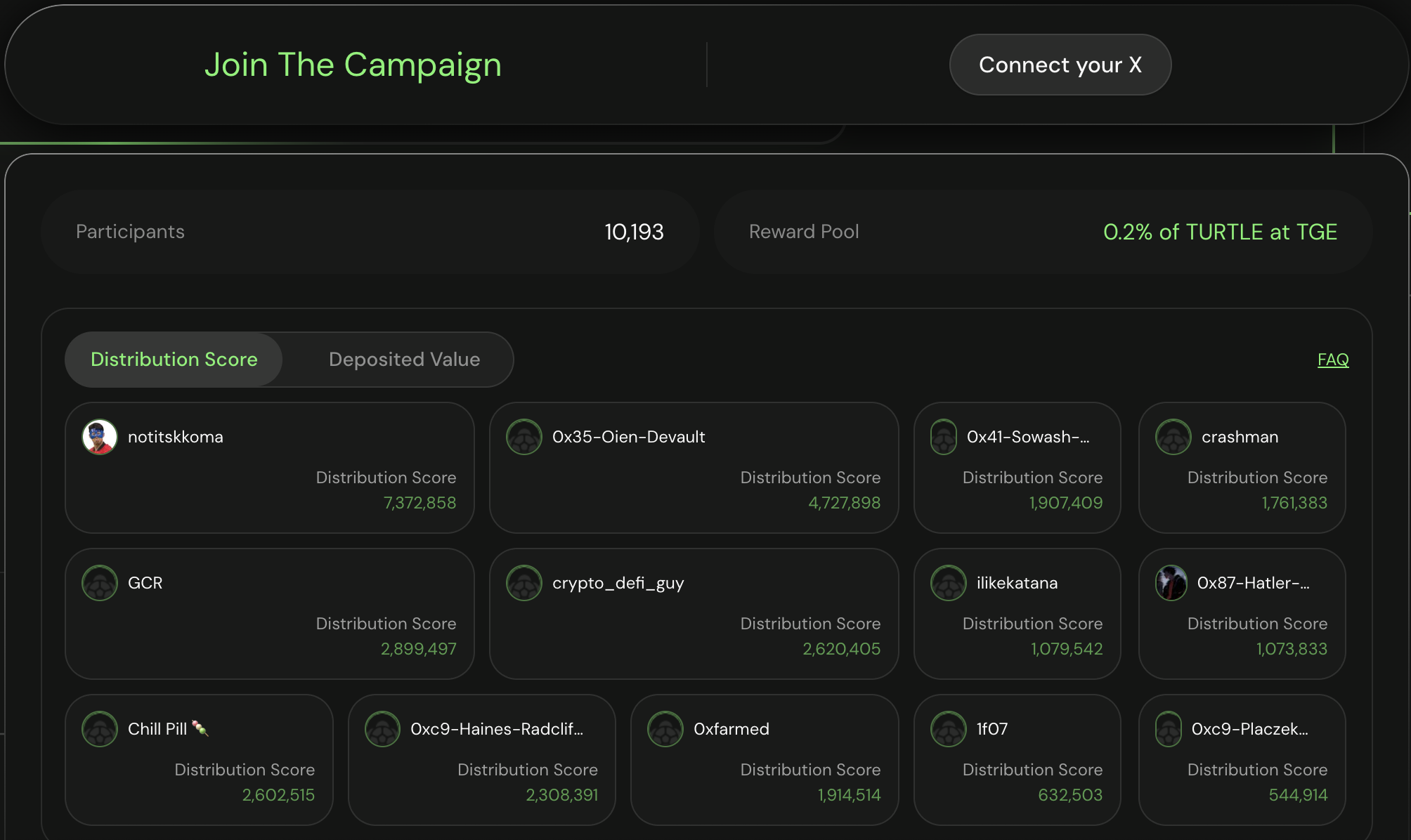 Turtle 此前推出了排行榜活动,向产品内存入资产并推荐他人存入资产均可获得积分,并最终基于积分获得代币奖励。对于本身就乐于参与 DeFi 挖矿的用户而言,完全可以通过 Turtle 协议节约繁复的操作 Gas 成本和研究时间成本,并获得额外的收益。